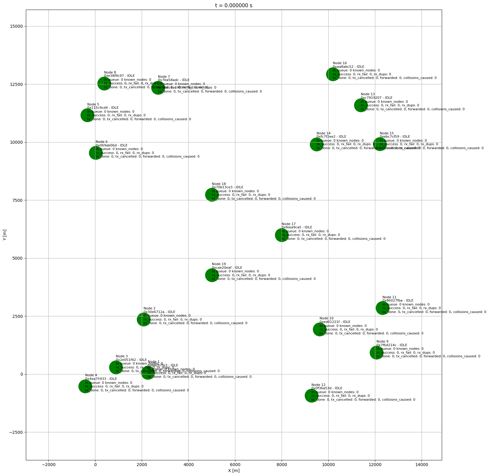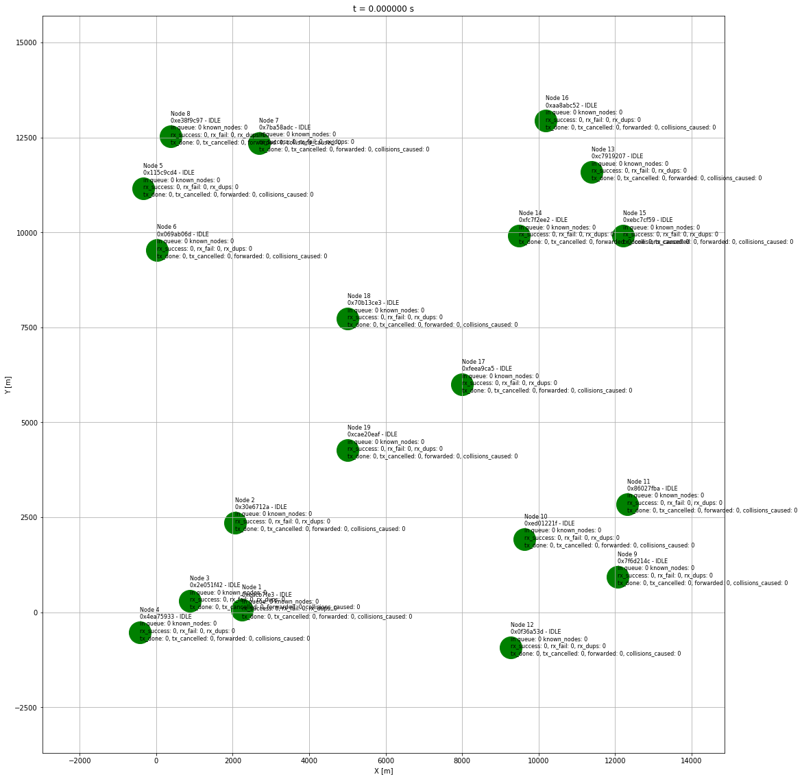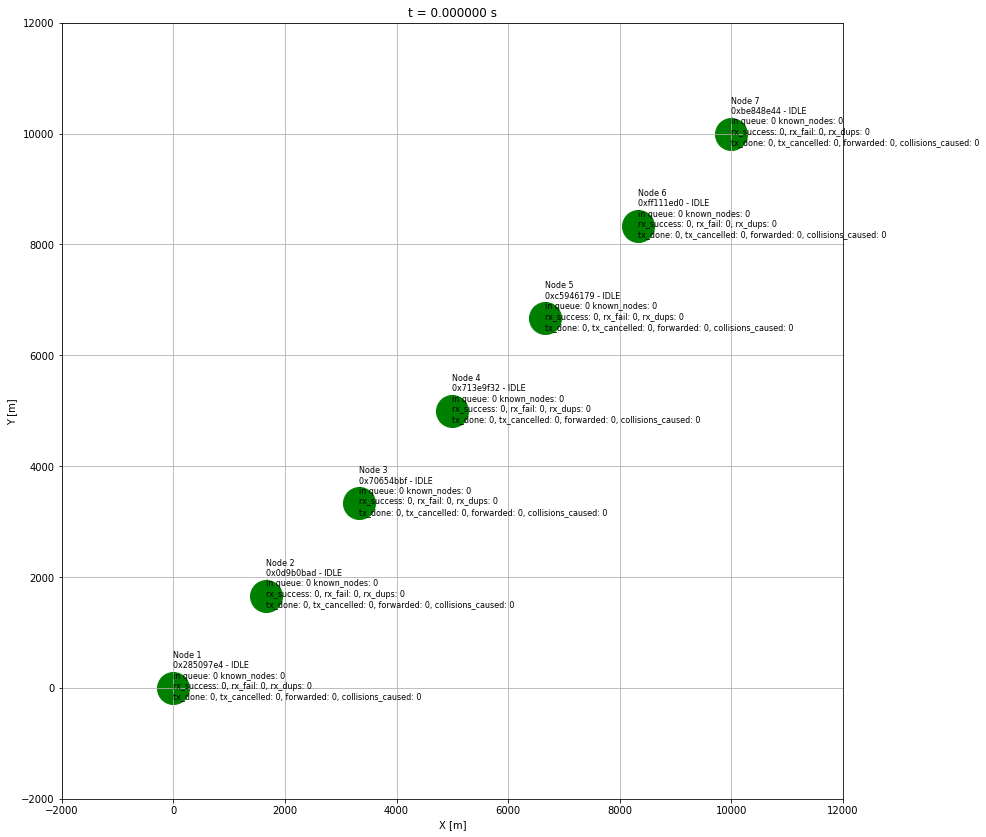 The same configuration as in example 1, but all nodes are working in MediumFast mode. The air statistics are lower, number of collisions is also lower and the success rate is higher despite the smaller range of the nodes.
