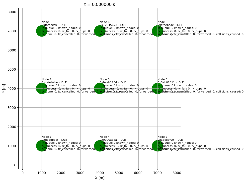 "Classic" mesh with 9 nodes working in LongFast and CLIENT mode. Nodes are sending broadcast messages with random interval from 0 to 15 seconds.